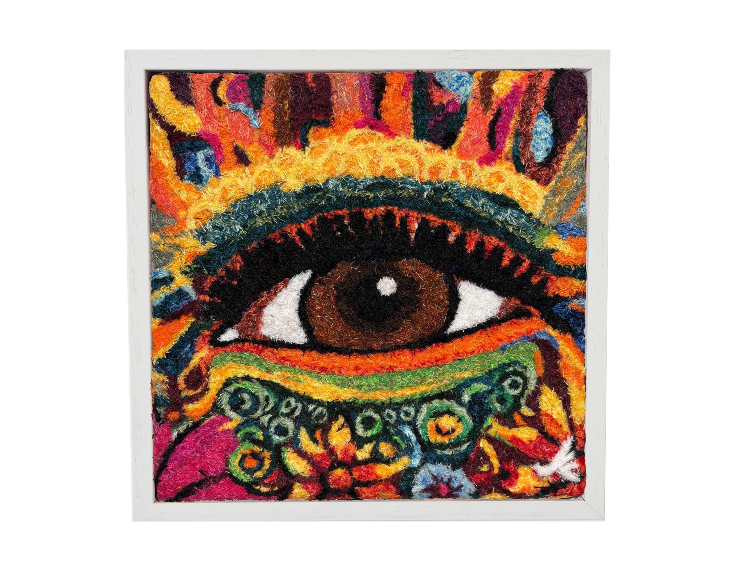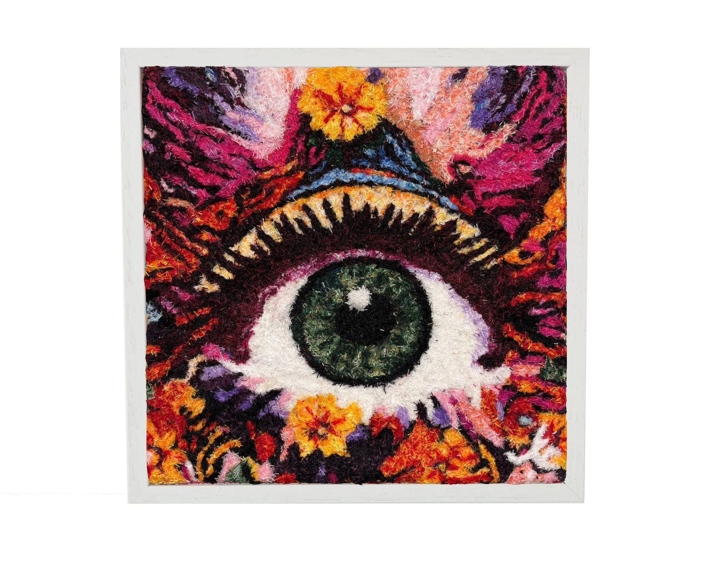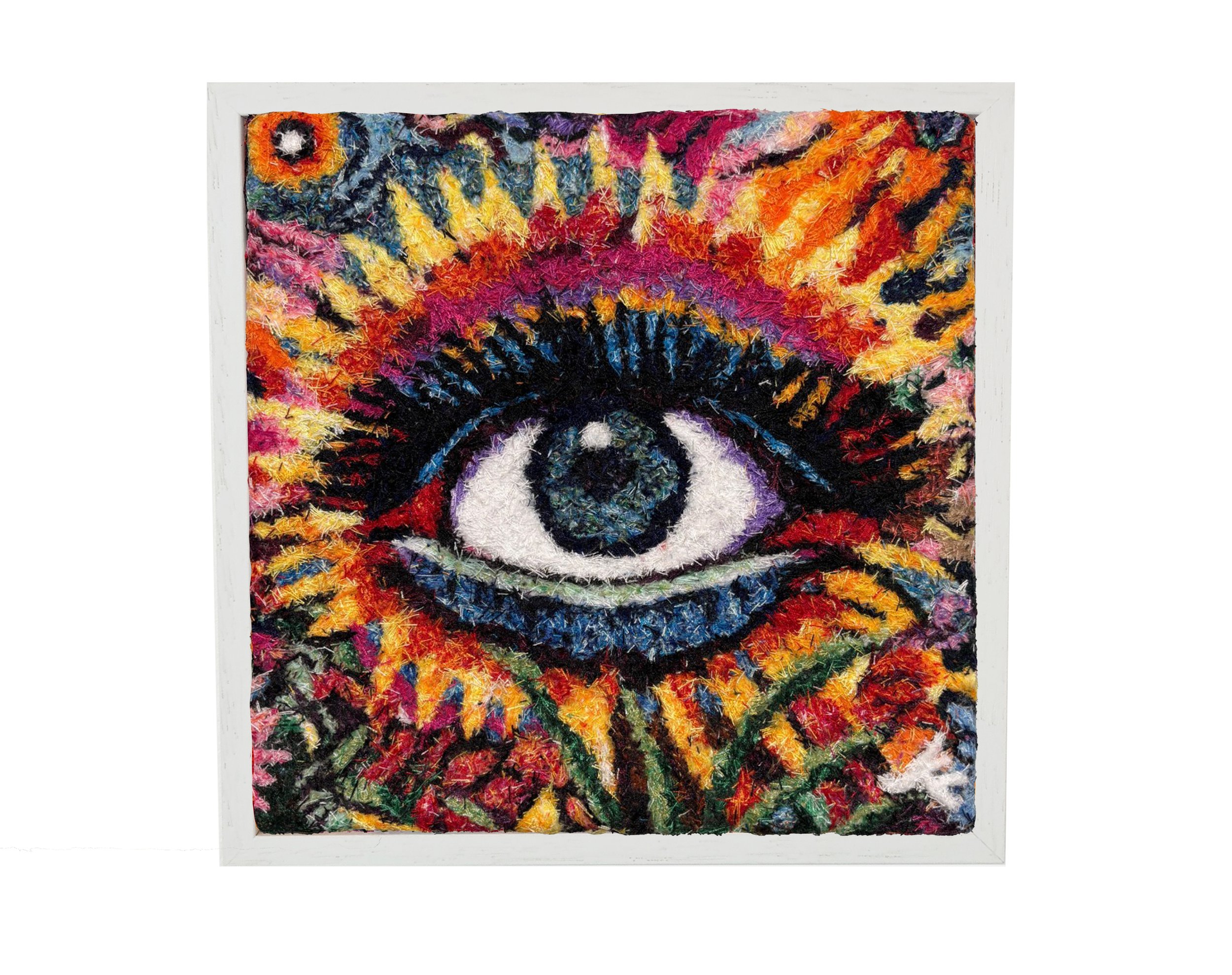 Each work is constructed through my Thread Blending technique layering hundreds of cut threads to create depth, movement and quiet intensity. At the centre of each composition sits a watchful eye, surrounded by bursts of colour and organic energy, symbolising awareness, perception and inner guidance.